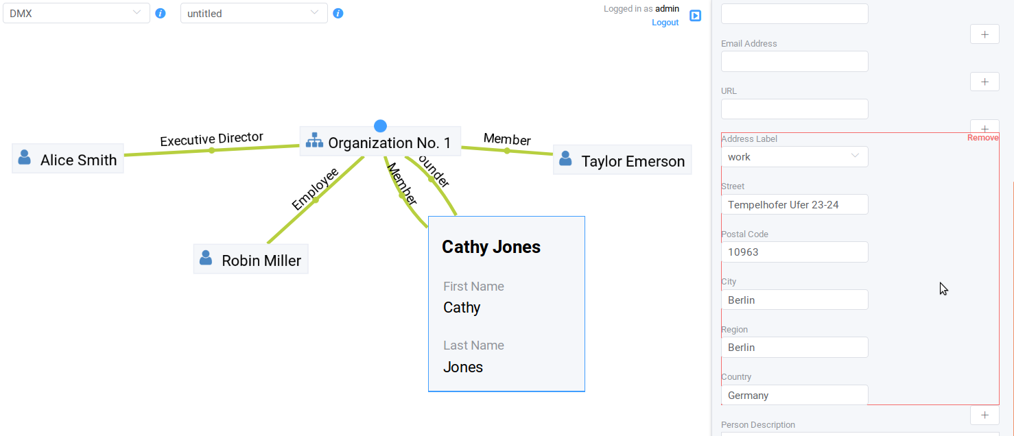 DMX offers a plugin to support geodata. Every topic with an address can be shown on a geographical map. The so-called geomaps are a special type of Topicmap in DMX. Geomaps are based on openstreetmap.org. Here is an example of how to create and populate them: Edit a person or an organization and add an address.