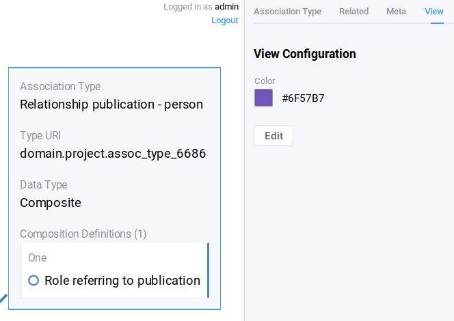 Let’s return to the example of a publication and its author: The authorship is a qualified description of the association between a person and a publication. If you look at the “Related” tab of such a qualified association you can see the connection between the association and and the association type: