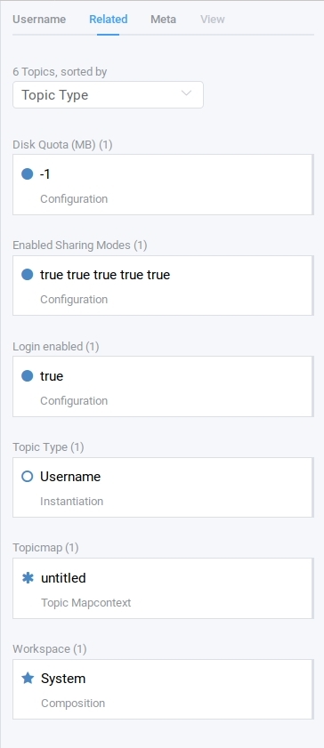 Note that in contrast to the Meta tab the “Related tab” lists all related database content, e.g. Topicmaps an item is part of but currently not visible in (hidden).